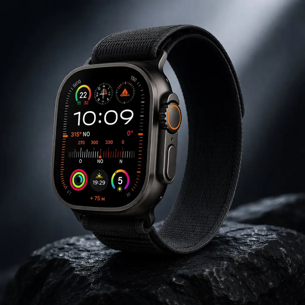 El Apple Watch Ultra 2 en su imponente acabado Black es una pieza de ingeniería superior. Su caja de 49 mm ofrece el equilibrio perfecto entre durabilidad y peso, protegiendo su pantalla capaz de alcanzar los 3,000 nits.